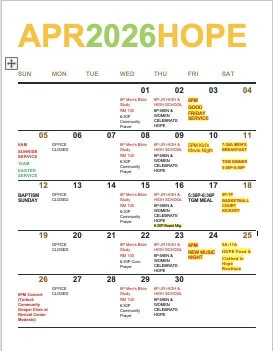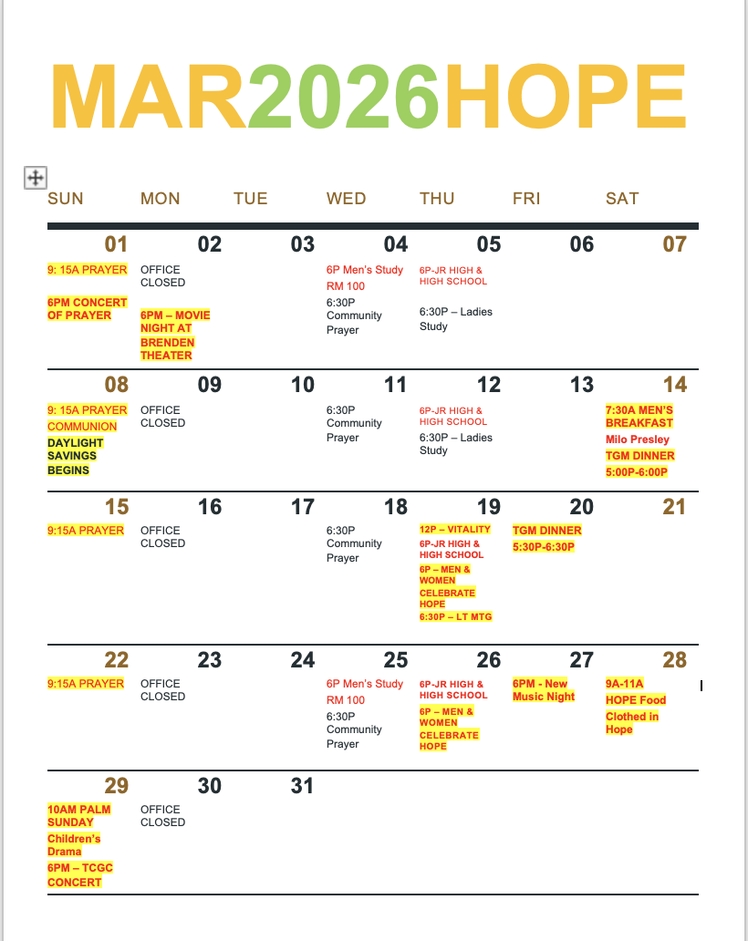Hope Calendar of Events